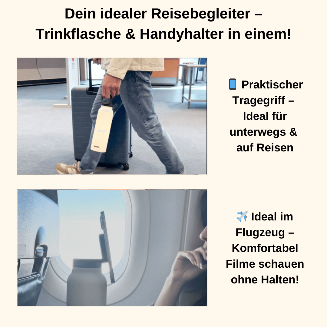 Die MagBottle Pro kombiniert eine hochwertige Trinkflasche mit magnetischem Handyhalter. Ideal für entspanntes Filmeschauen, sichere Videoanrufe und optimale Hydrierung auf jeder Reise oder unterwegs!